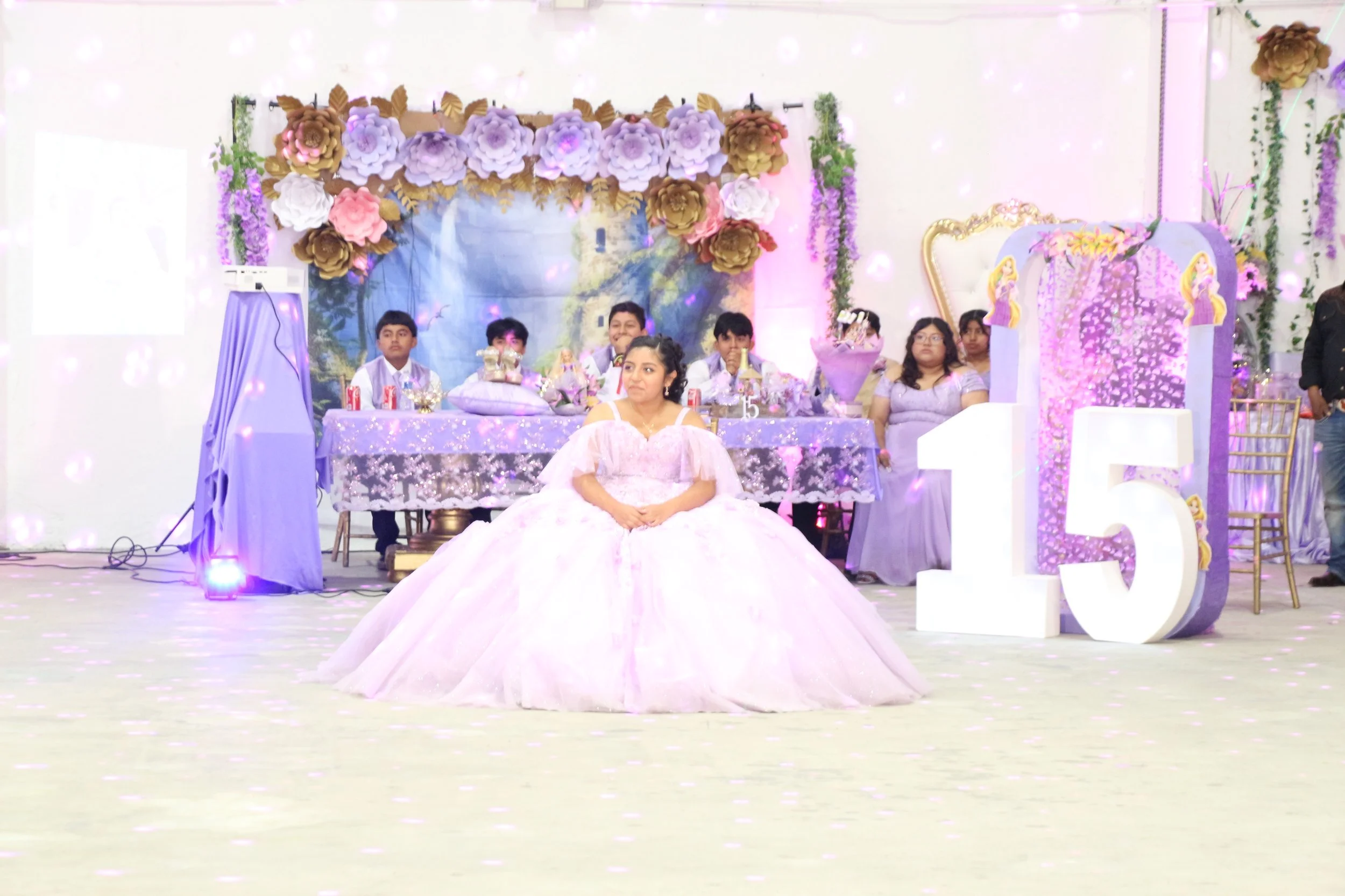 A young girl in a pink ball gown sitting in front of a decorated table for her quinceañera celebration with large number 15 in white beside her, surrounded by friends and family, with floral and fairy tale themed decorations.
