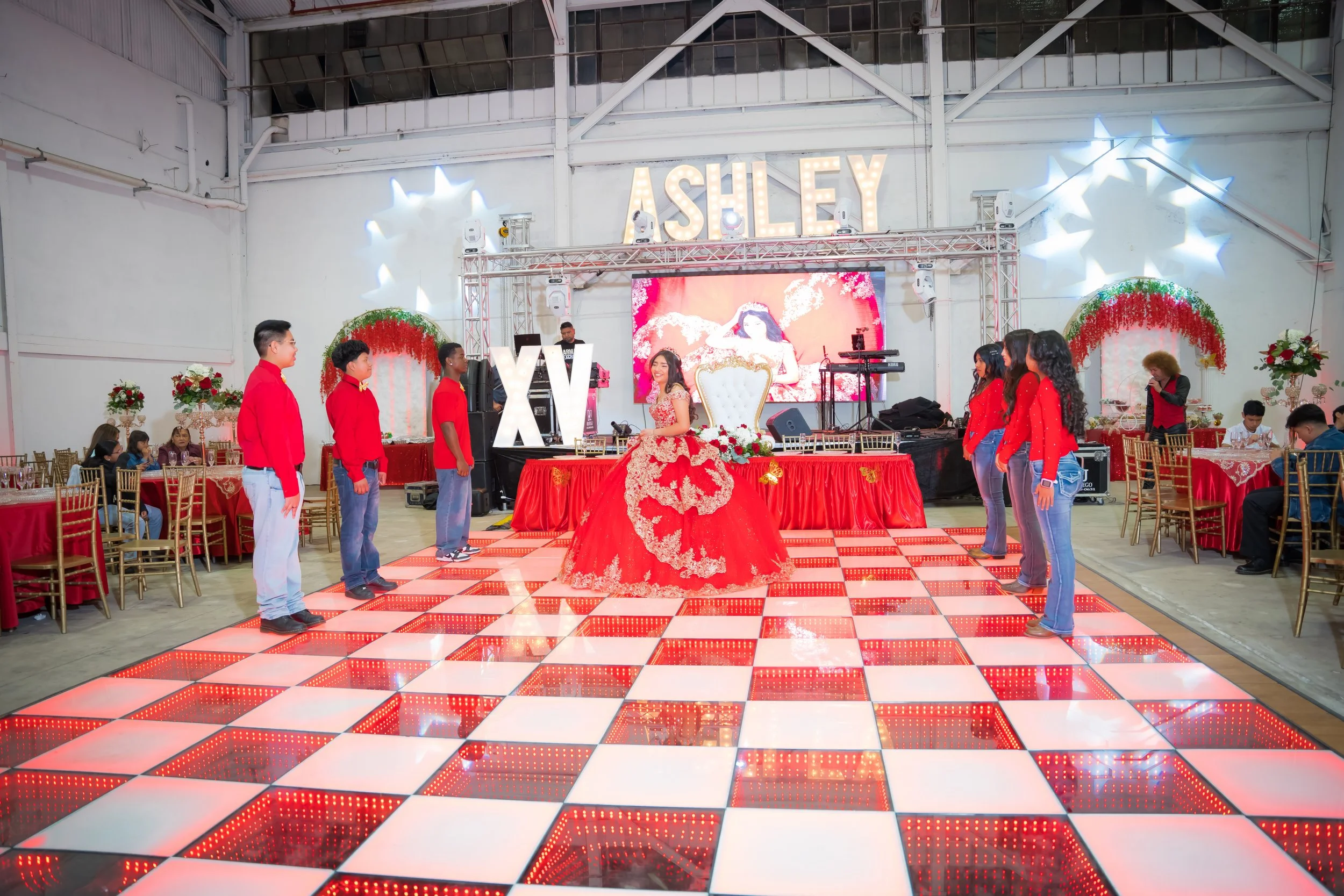 A girl in a red and gold quinceañera dress sits on a decorative throne at her birthday celebration, surrounded by friends in red shirts and jeans on a checkered dance floor. The event features a stage with large illuminated letters spelling 'ASHLEY'