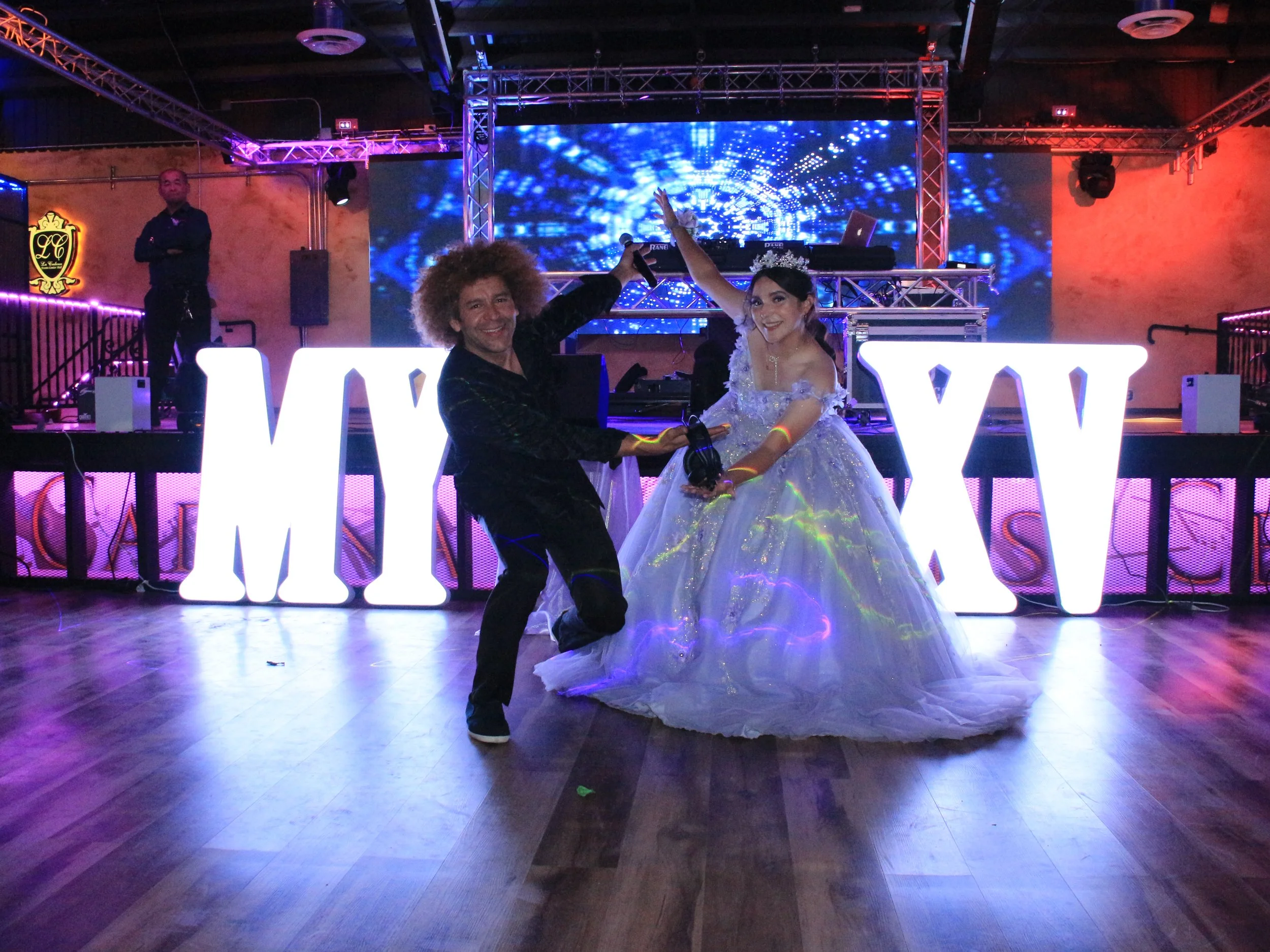 A woman in a white gown and a man in a black suit with curly hair dancing in front of large illuminated letters spelling 'MYX'. The background features a stage with a DJ setup and a digital screen displaying blue abstract visuals.