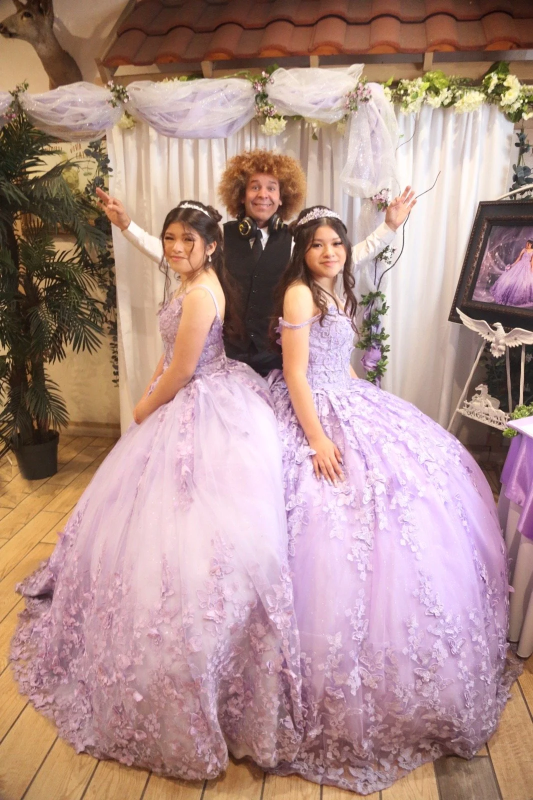 Two young girls in lavender princess dresses and a man with curly hair in a black shirt behind them, at a decorative photo booth with white curtains, flowers, and a portrait of a princess.