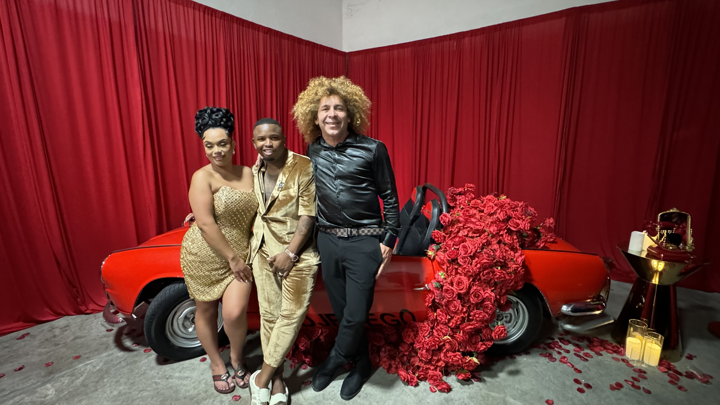 Three people posing in front of a red vintage car decorated with red roses and rose petals. The background is red curtains, and there are candles and a small table with a mirror and accessories.