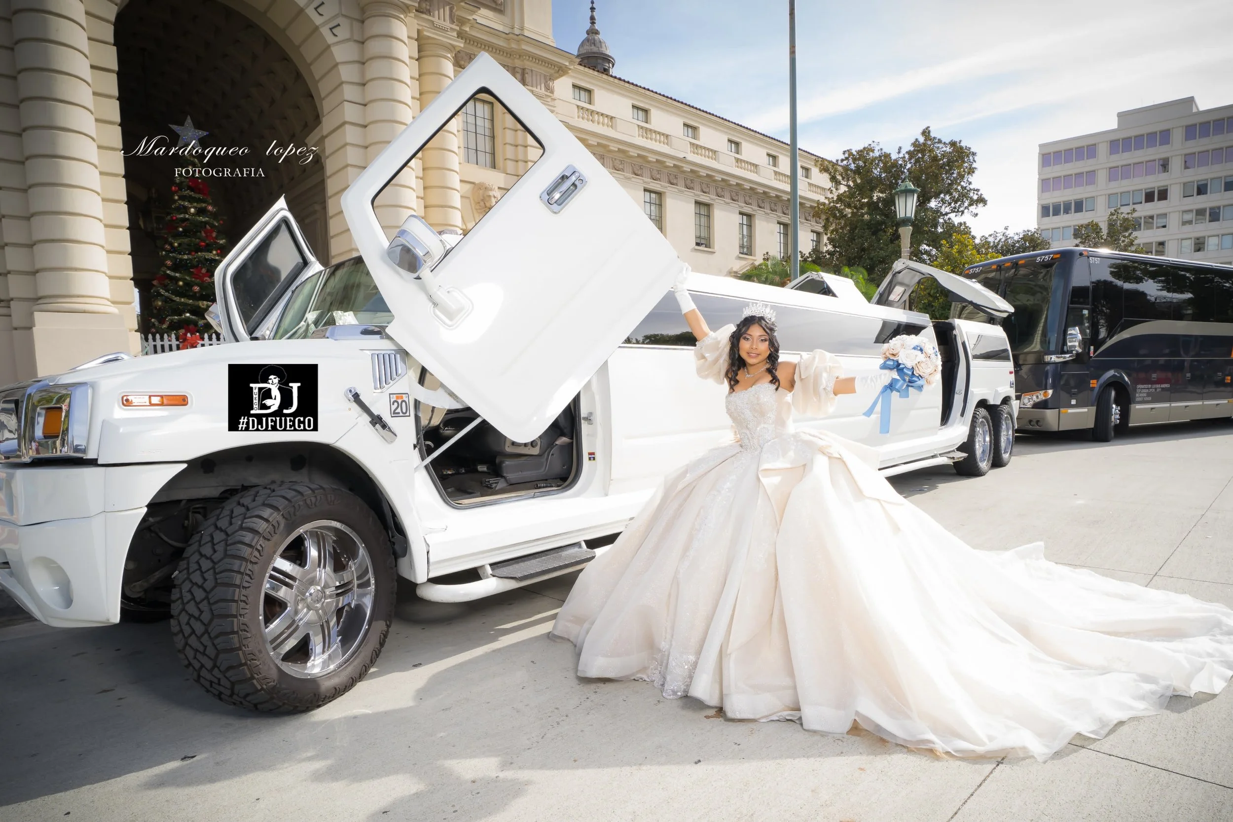 Bride in wedding dress standing next to a white stretch limousine holding a bouquet of flowers, with the limousine's door open and a tall black bus in the background, in an urban setting with buildings and trees.