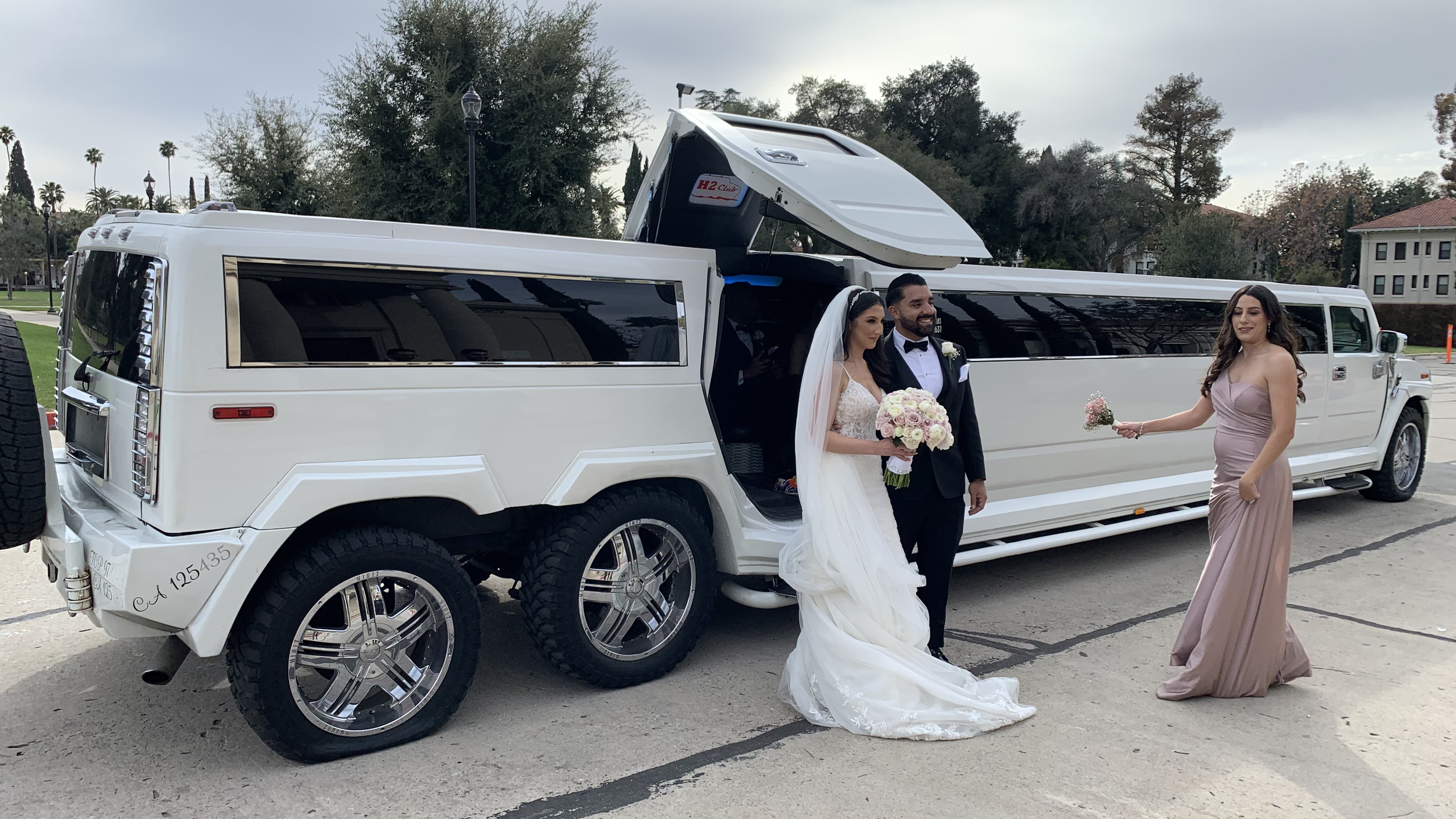 A bride and groom stand beside a white stretch limousine on their wedding day, with the groom holding a bouquet of flowers. A woman in a blush gown holds a smaller bouquet and is standing outside the limousine, which has its door open.