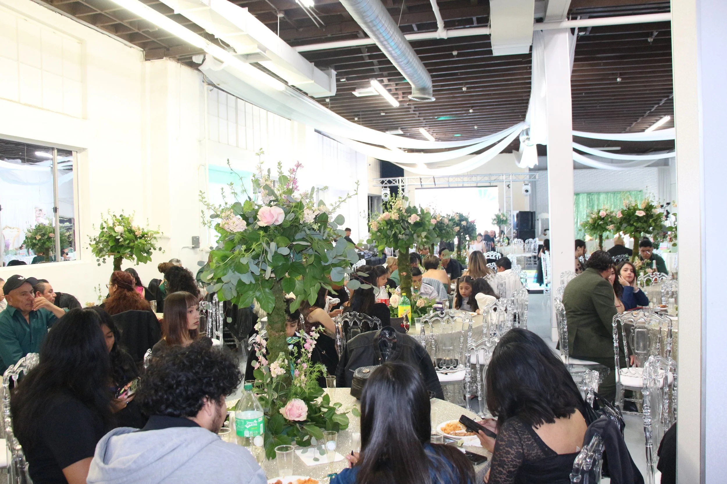 People gathered at long tables with floral centerpieces at indoor event with white drapery and a large projection screen in the background.