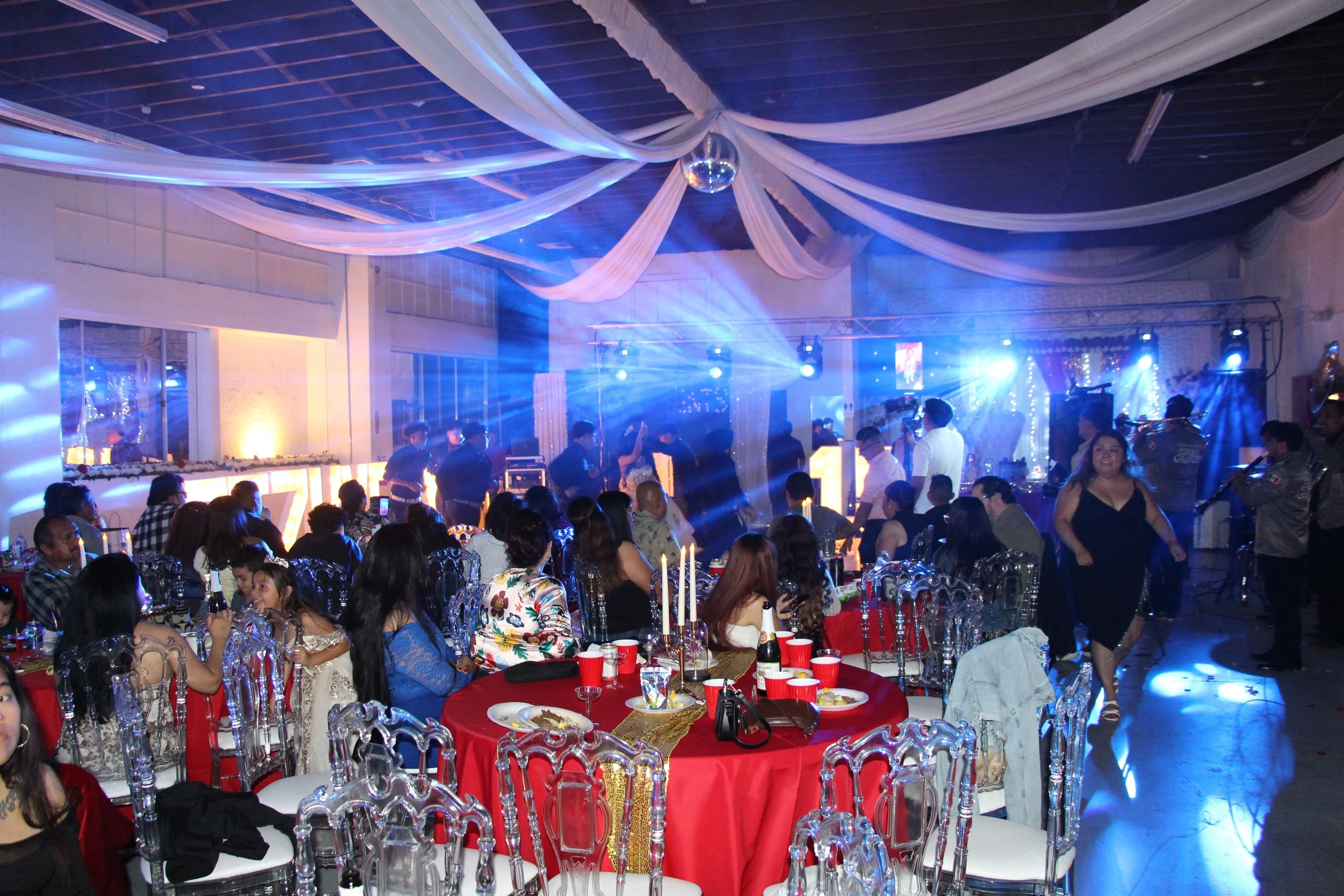 Guests seated at tables with red tablecloths enjoying music and dancing in a decorated hall with white drapes and disco balls, illuminated with blue and white lights.