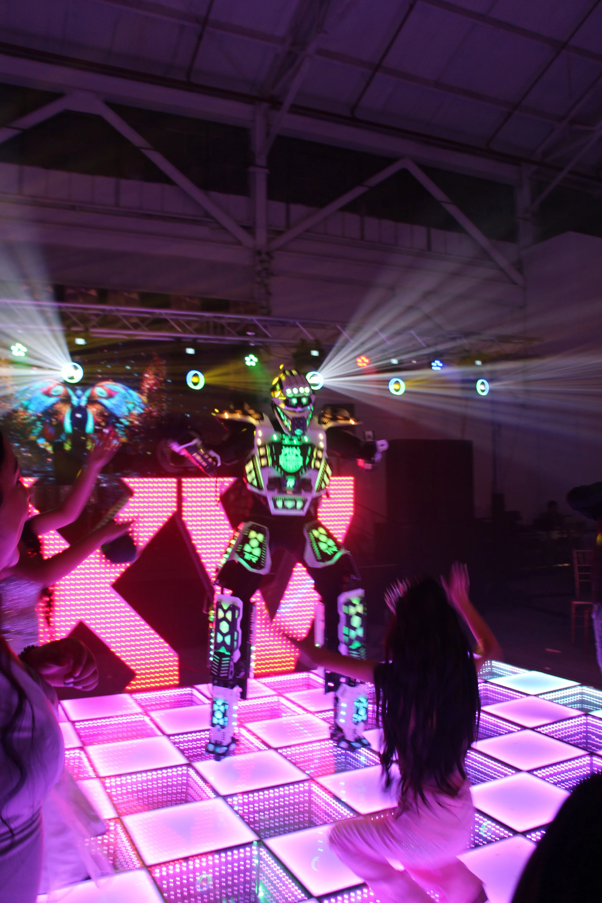 Three individuals in LED illuminated costumes standing outdoors at night with a stage and DJ equipment in the background.