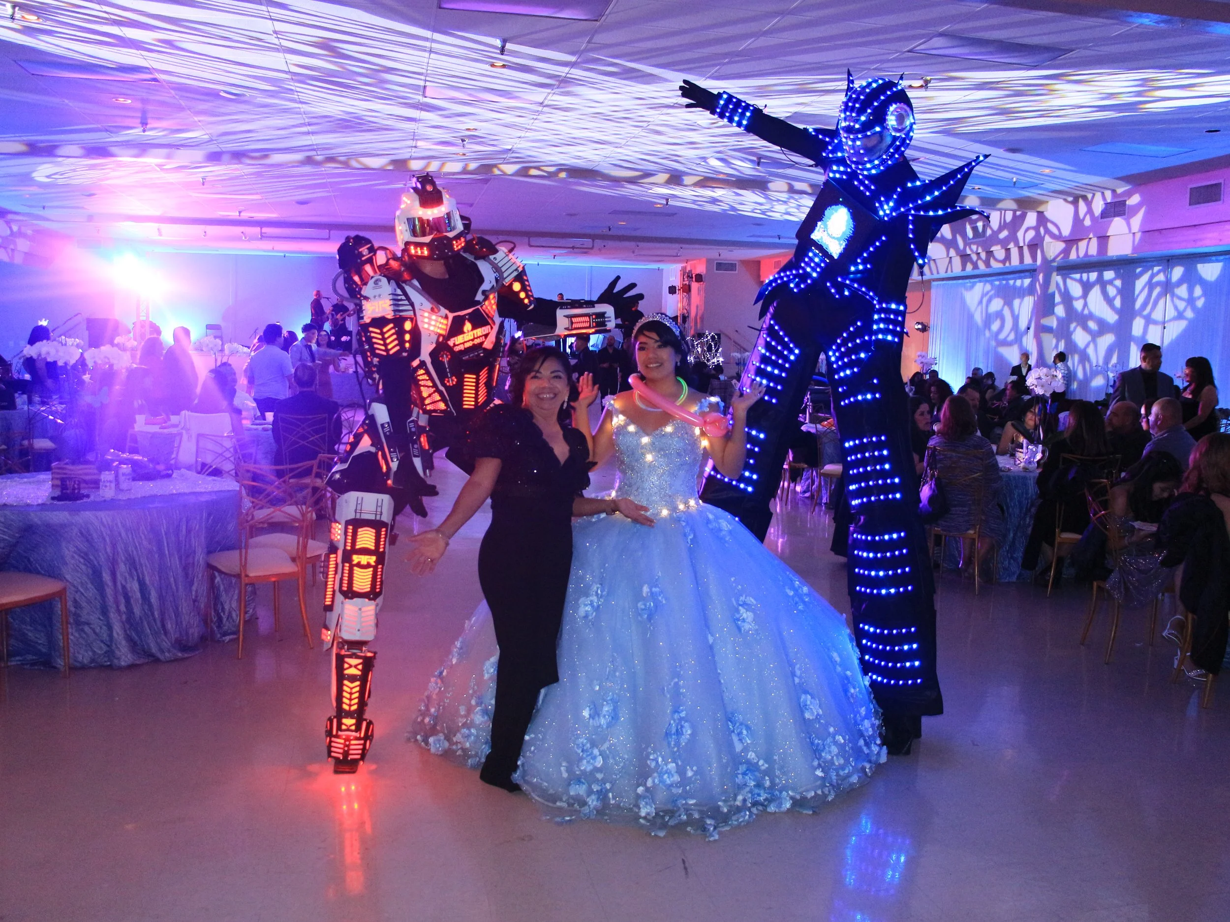 People at a party with two performers in robot costumes, one in black with blue lights and the other in black with red lights, posing with two women, one in a black dress and the other in a blue ball gown, in a decorated event hall with tables and gu