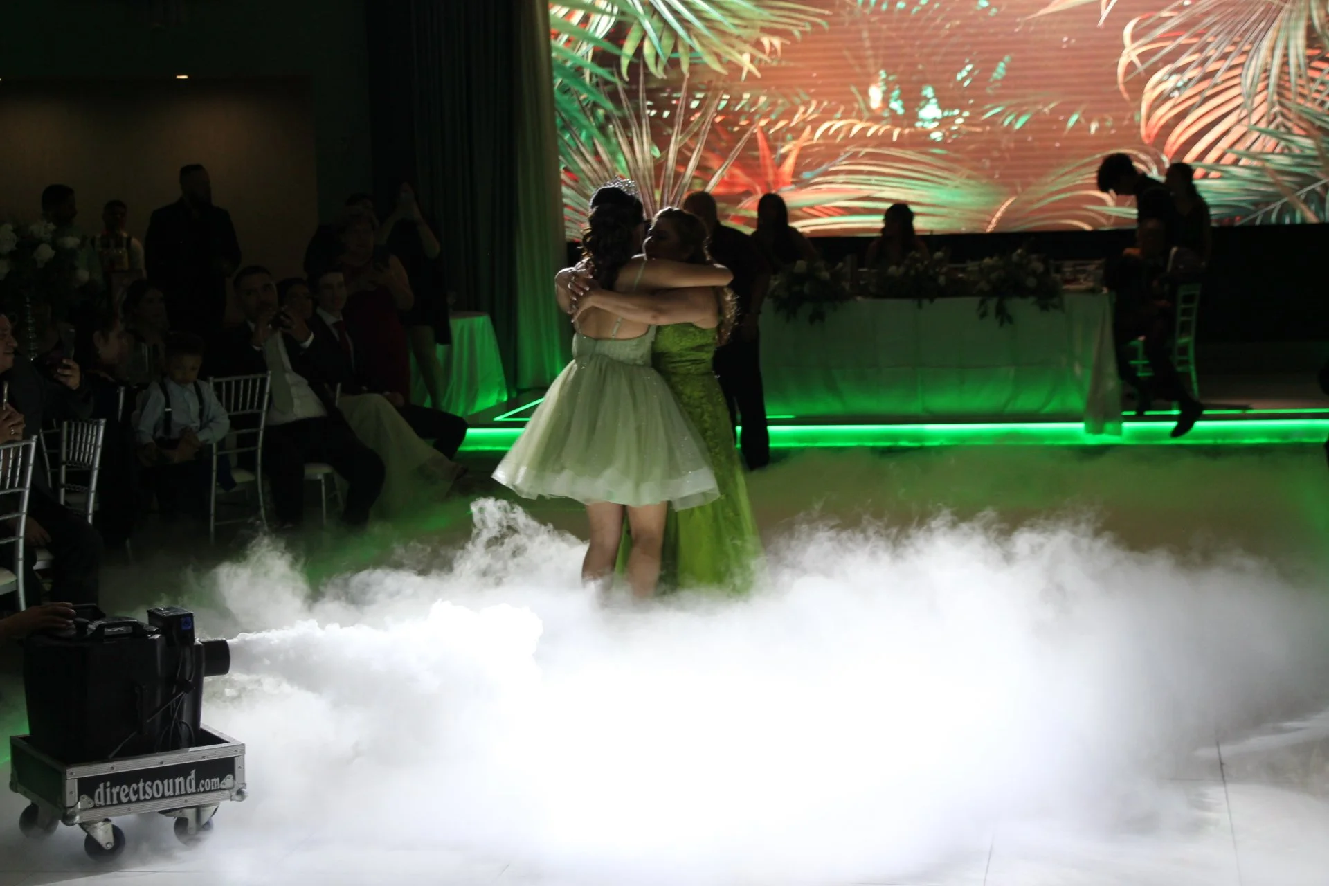 Two women dance closely together on a foggy dance floor at a wedding reception, surrounded by seated guests and a colorful tropical-themed backdrop.