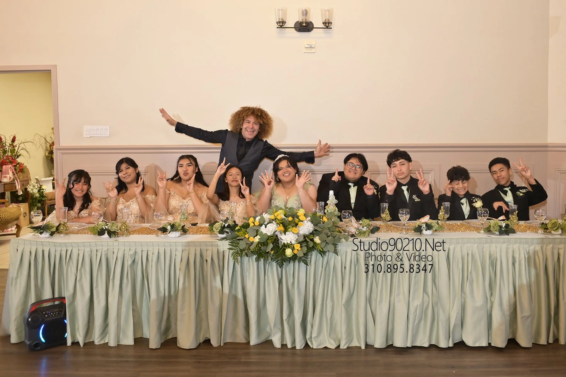 Group of people at a wedding reception sitting at a decorated banquet table, with a woman in a wedding dress and others in formal attire. A man with curly hair stands behind the table, smiling and making playful gestures. The table is adorned with a