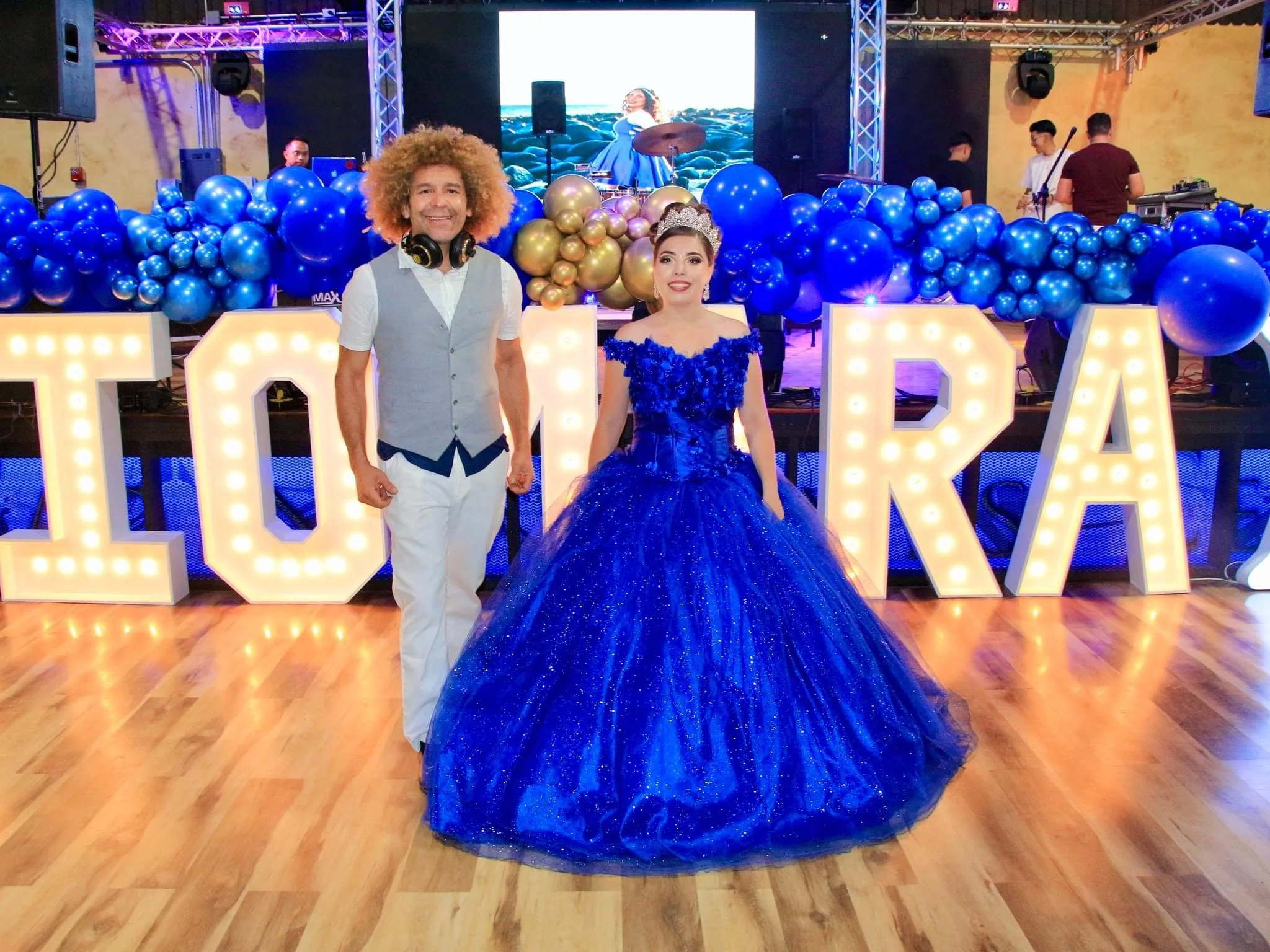 A young woman in an elegant, royal blue ball gown with sparkling details and a tiara, posing next to a man in a light gray vest and white pants at a celebration or quinceañera event. Behind them, large illuminated letters spell out 'LOUR' with balloo