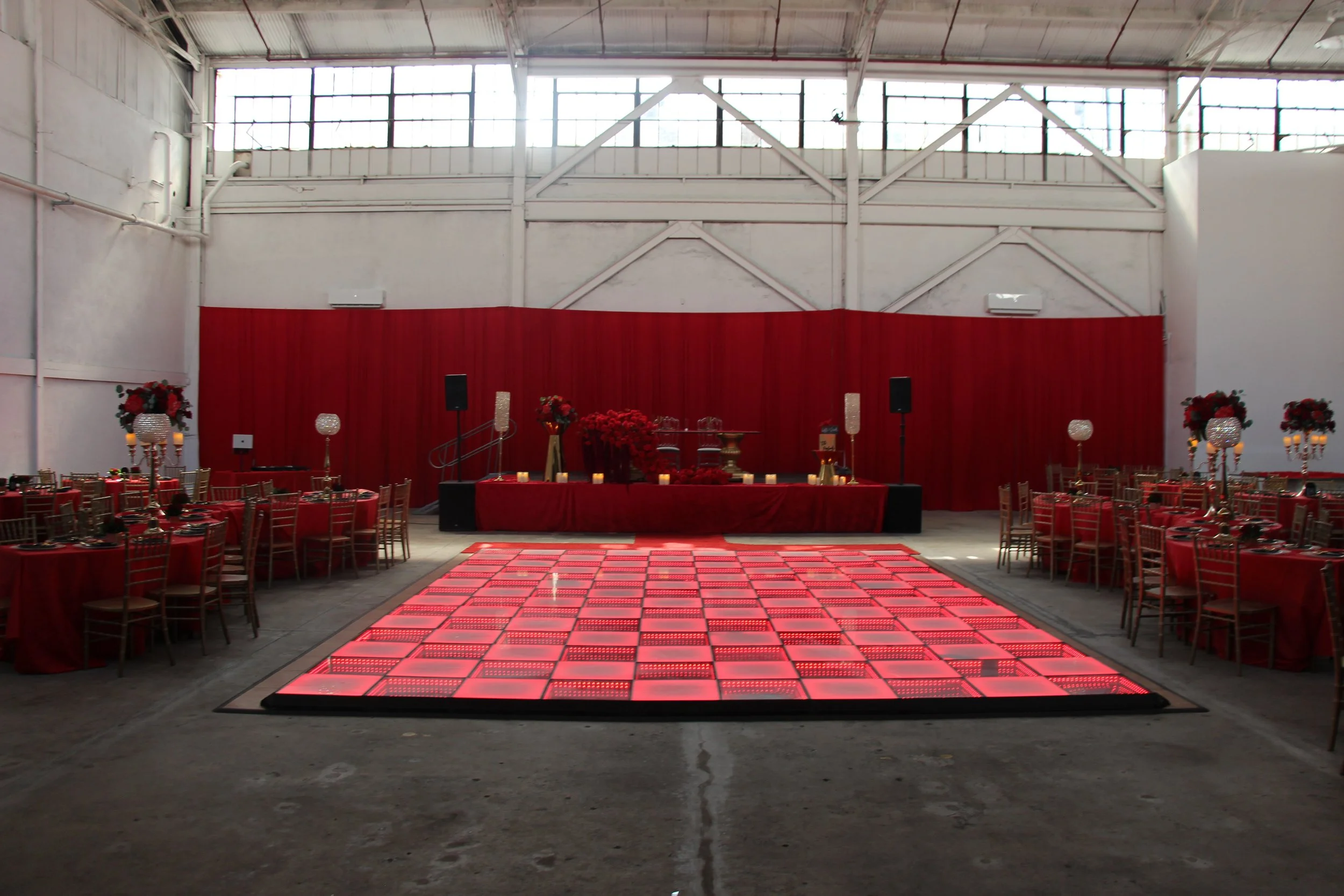 Indoor event space decorated in red with round tables, chairs, floral arrangements, candles, and a red-lit dance floor in the center, set up for a celebration or party.