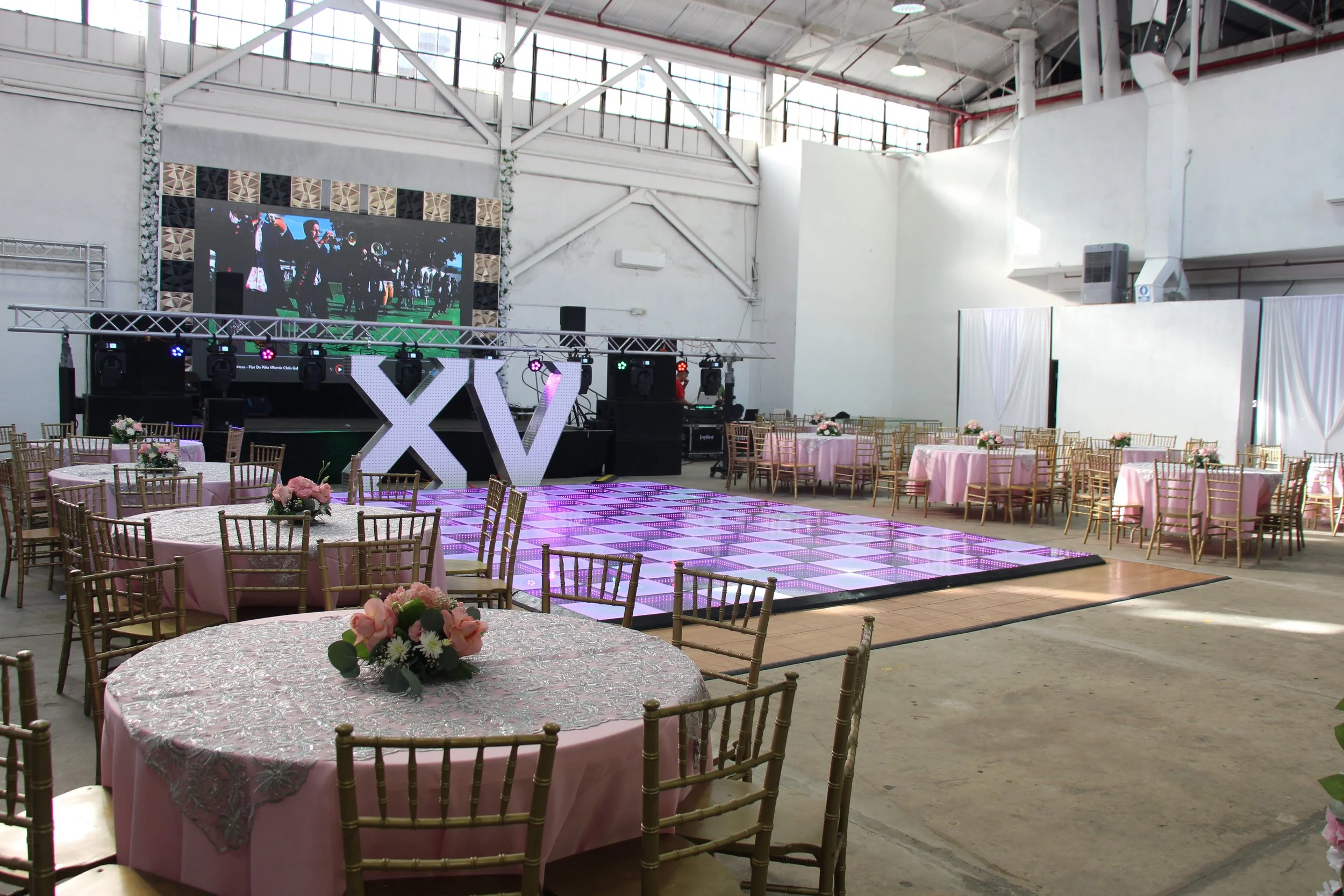 Wedding reception setup with round tables covered in white and light blue tablecloths, decorated with floral centerpieces, surrounded by gold chairs. Large illuminated numbers 'XV' are on the stage, which has a piano and curtains, in a spacious hall