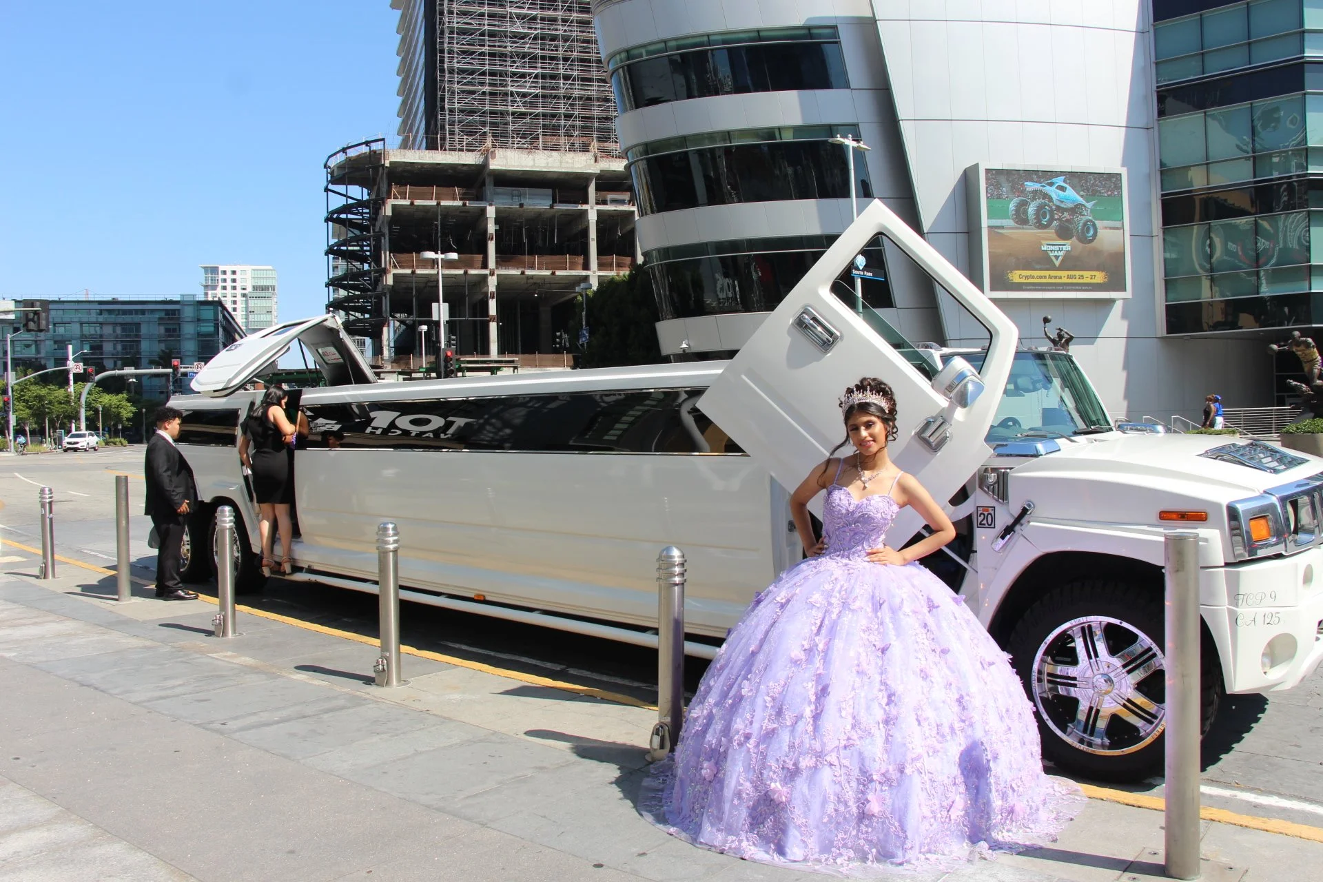 A young woman in a lavender ball gown and tiara standing in front of a white limousine limousine with its front door open, in an urban area with tall buildings and a digital billboard in the background. Two people, a man in a black suit and a woman i