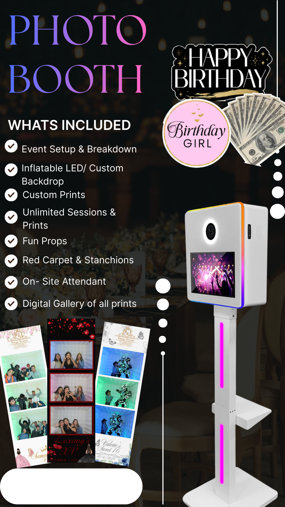Perfect for weddings, birthdays, corporate events, and celebrations of all kinds, with custom overlays, fun props, red carpet and instant sharing options